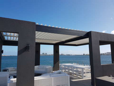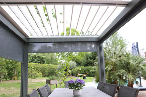 La pergola bioclimatique est conçue pour offrir une grande surface d'ombre et un confort thermique optimal. Grâce à ses lames orientables, vous pouvez réguler l'ensoleillement et évacuer la chaleur de manière naturelle. Elle vous permet de profiter de votre extérieur, même sous la pluie, grâce à son système de gouttières intégré.